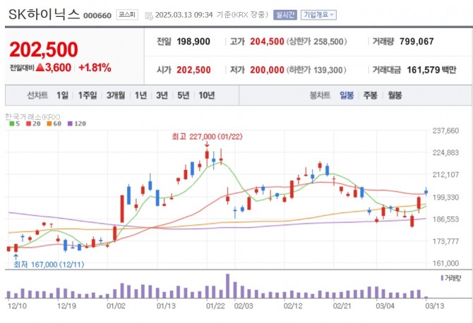 이미지 확대보기13일 한국거래소에 따르면 오전 9시 34분 기준 SK하이닉스는 전 거래일보다 1.81% 오른 20만2500원에 거래 중이다.