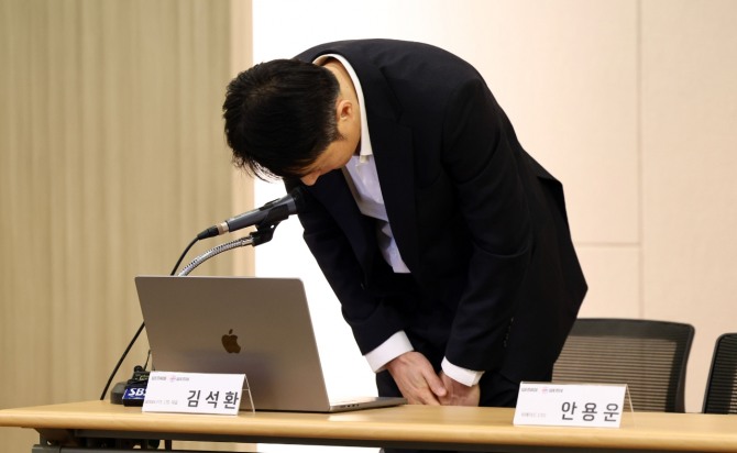 김석환 위믹스 PTE.LTD 대표가 17일 경기도 성남 분당구 판교 한컴타워에서 열린 위믹스 가상화폐 해킹 피해 관련 긴급 간담회에서 고개 숙여 사과하고 있다. 사진=연합뉴스