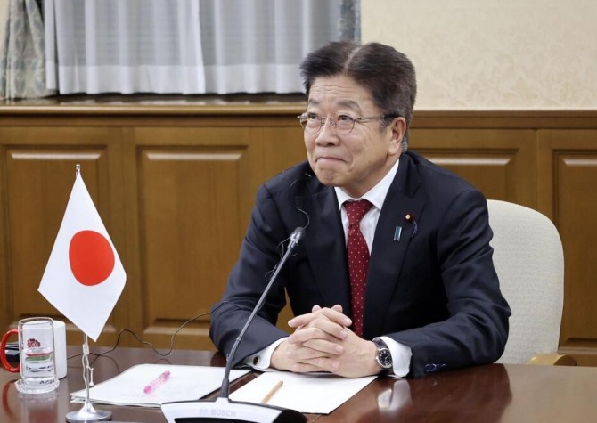 가토 일본 재무상이 17일 밤 G7 재무장관 온라인 회의에 참석하고 있다. 사진=일본 재무성