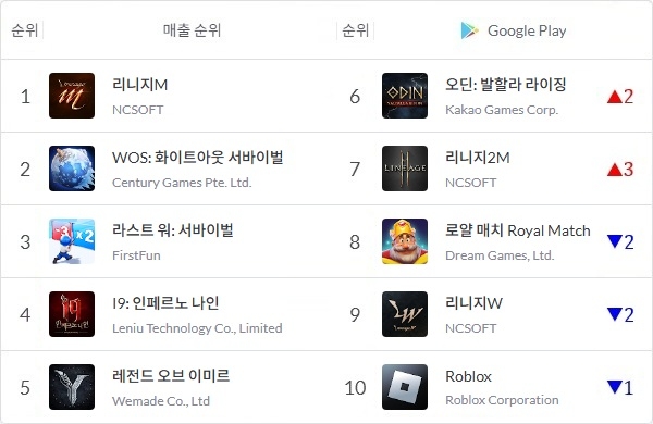 이미지 확대보기22일 IGA웍스 앱 통계 분석 플랫폼 모바일인덱스의 구글 플레이스토어 매출 순위를 살펴보면 1위 '리니지M'부터 5위 '레전드 오브 이미르'까지 톱5가 15일부터 22일까지 1주 동안 제 자리를 지켰다.