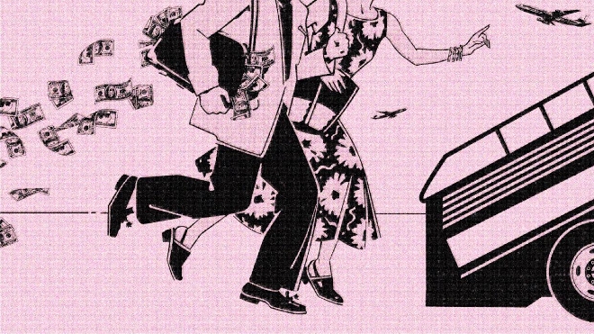 비행기에 오르는 부유층 커플의 그림. 사진=더애틀랜틱이미지 확대보기