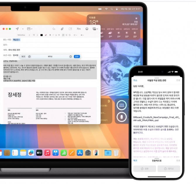 애플 인텔리전스를 활용한 '글쓰기 도구'로 글을 작성한 모습. 사진=애플이미지 확대보기