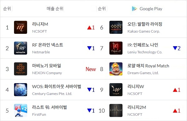 이에 앞서 엔씨소프트의 '리니지M'이 3일을 기점으로 넷마블 'RF 온라인 넥스트'로부터 1위 자리를 탈환했다. 이에 따라 국산 MMORPG들이 매출 톱3를 장악했다.