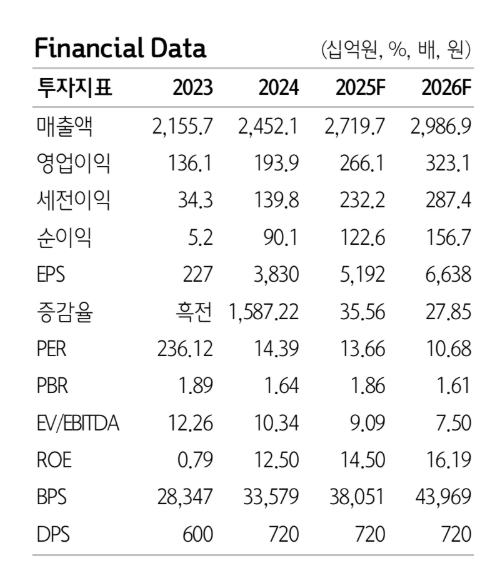 이미지 확대보기한국콜마의 2025년 실적은 연결 기준 매출액이 전년 대비 11% 증가한 2조 7000억원, 영업이익은 37% 증가한 2700억원(영업이익률 10%)이 전망된다. 이는 역대 최대 실적으로 예상된다.