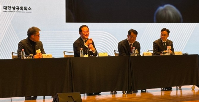 (왼쪽부터) 김대영 한국국가전략연구원 군사전문 연구위원과 문근식 한양대 공공정책대학원 특임교수, 홍석준 한화에어로스페이스 전무, 정우만 HD현대중공업 상무가 15일 서울 중구 대한상의에서 열린 ‘한미 산업협력 컨퍼런스’에서 토론하고 있다. 사진=글로벌이코노믹이미지 확대보기