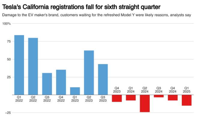 CNCDA는 전날 낸 보고서에서 “노후한 제품 라인업과 일론 머스크 테슬라 최고경영자(CEO)의 정치적 행보에 대한 반감이 시장 점유율 하락의 주요 원인으로 보인다”고 밝혔다.