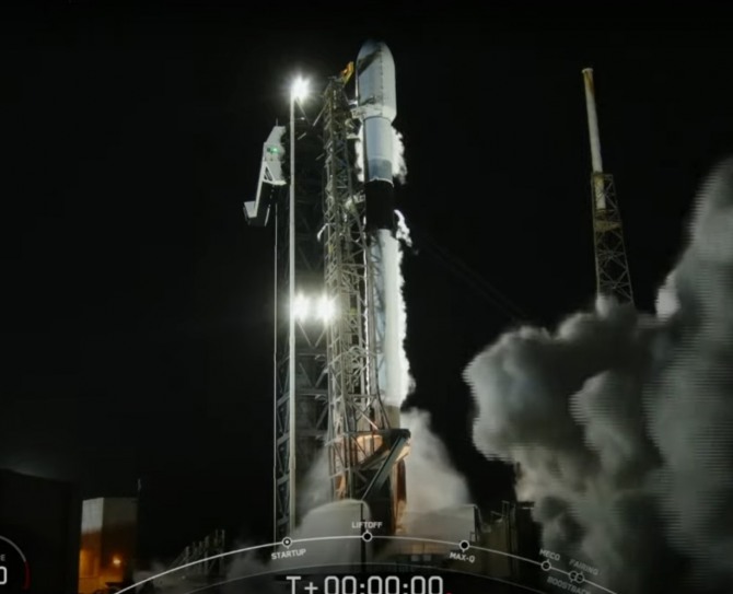 한화시스템이 만든 합성개구레이더(SAR) 탑재체가 들어간 대한민국의 4번째 정찰위성이자 3번째 SAR 위성이 22일 오전 9시 48분(한국시각) 미국 플로리다주 케이프 커너베럴 우주군기지에서 스페이스X사의 팰컨-9 발사체에 실린 채 발사되고 있다. 출처=스페이스X