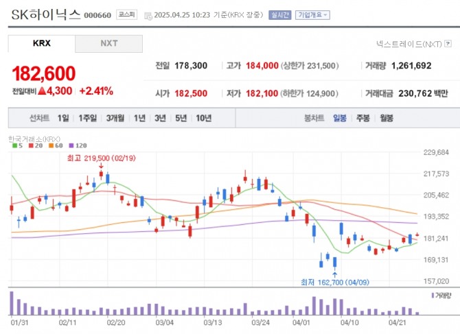 25일 한국거래소에 따르면 SK하이닉스는 오전 10시23분 전일보다 2.41% 오른 18만2600원을 기록하고 있다.