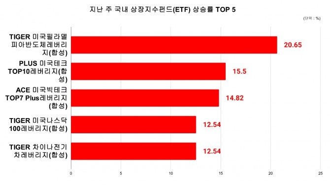이어 한화자산운용의 'PLUS 미국테크TOP10레버리지(합성)'은 15.50% 오르며 2위를 차지했고 한국투자신탁운용의 'ACE 미국빅테크TOP7 Plus레버리지(합성)'이 14.82% 오르며 3위 자리를 차지했다.
