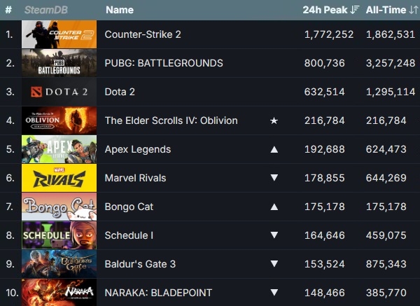 2025년 4월 27일 기준 스팀 게임들의 최다 동시 접속자 순위. 화살표는 20일 대비 순위 변동을 나타낸 것. 사진=스팀 데이터베이스