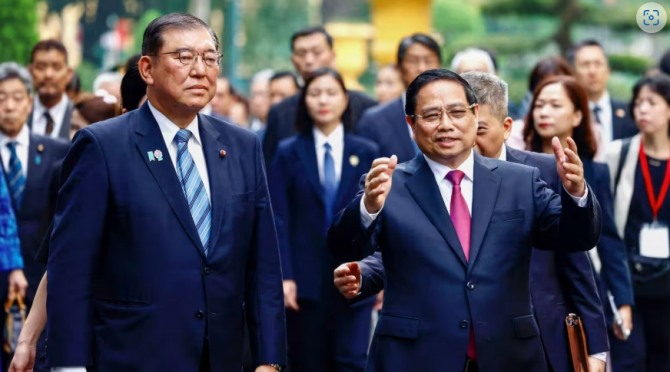 이미지 확대보기이시바 총리는 28일 베트남 하노이에서 팜 민 친 베트남 총리와 회담을 갖고 미국의 보호무역주의에 맞서 다자간 자유무역 강화에 합의했다. 양국은 또한 차관급 외교·국방 대화 체계를 구축하기로 합의했으며, 일본은 베트남을 공식 안보 지원 제도에 따른 방위 장비 수혜국 목록에 추가할 계획이다.