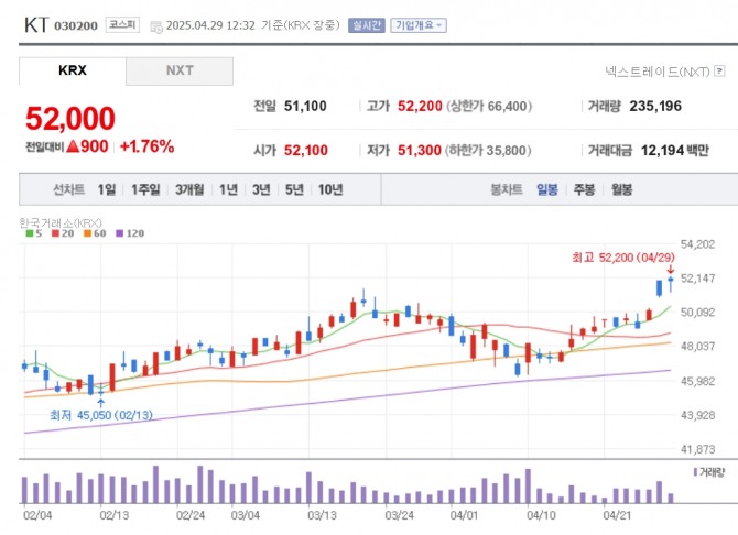 이미지 확대보기29일 한국거래소에 따르면 오후 12시 32분 현재 KT는 전 거래일 대비 1.76% 오른 5만 2000원에 거래되고 있다. 주가는 장 초반 5만 2200원에 올라 전일에 이어 52주 신고가를 기록했다.
