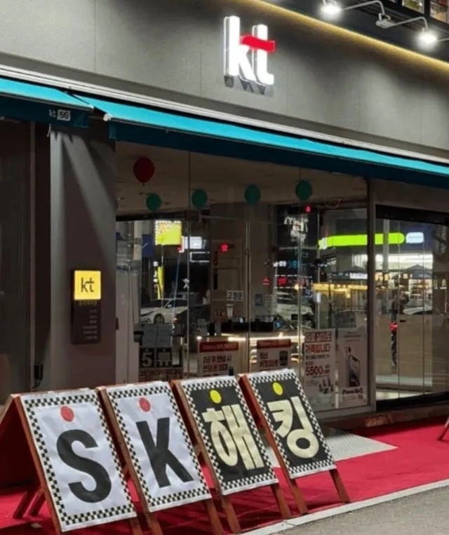 일부 KT 대리점에서 'SK 해킹'이라는 문구를 내건 사진이 온라인에서 주목받고 있다. SK 고객의 자사 유치를 위해 일부 대리점들이 무료 유심 교체 등을 내세워 공격적인 자체 마케팅에 나서는 모습이다. 사진=온라인 커뮤니티 캡처