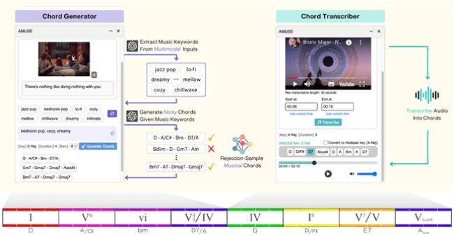 어뮤즈는 두 단계의 하이브리드 생성 방식으로 작동한다. 우선 대형 언어 모델을 활용해 입력된 문장이나 이미지 등에서 어울리는 음악적 코드 구성을 프롬프트 방식으로 유도한 뒤, 실제 음악 데이터로 훈련된 AI 모델이 어색한 결과물을 걸러내는 리젝션 샘플링 기법을 적용한다. 이 과정을 통해 창작자에겐 더욱 자연스럽고 조화로운 제안이 제공된다.