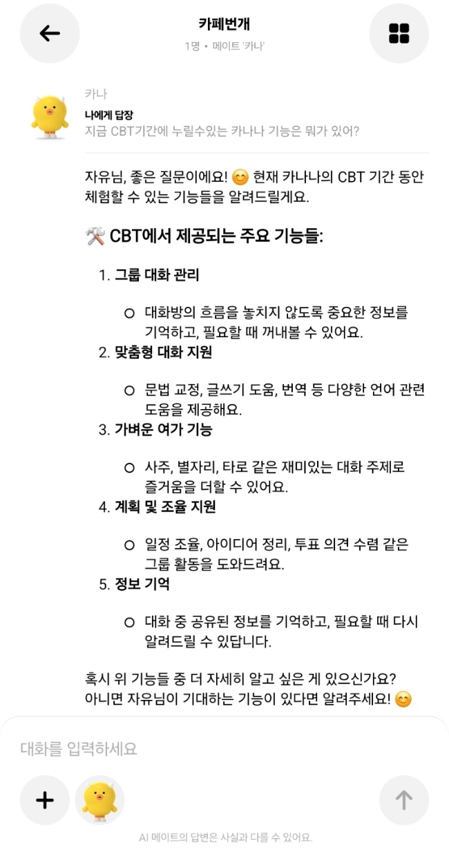 서비스는 두 가지 메이트로 구성된다. 개인형 AI 메이트 '나나'는 개인 및 그룹 대화 모두에서 활동하며, 이용자의 정보를 학습해 맞춤형 답변을 제공한다. 그룹 메이트 '카나'는 동호회, 조별 과제, 가족방 등에서 대화 내용을 파악해 일정을 등록하거나 요약해주는 등 '서포터' 역할을 수행한다. 예컨대 러닝 모임에서는 마라톤 일정을 등록하고 리마인드 알림을 보내며, 관련 코스를 추천하는 기능도 제공한다.