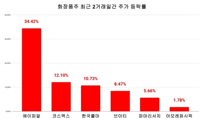 화장품주 강세는 실적이 뒷받침했다. 에이피알은 올해 1분기에 매출 2660억 원, 영업이익 546억 원을 기록했다. 이는 전년 동기 대비 각각 79%, 97% 증가한 수치다. 분기 매출액이 2500억 원을 넘어선 것은 이번이 처음이다. 2개 분기 연속 2000억 원대 매출을 기록했다.