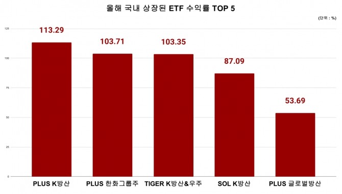 'PLUS 한화그룹주'(103.71%)와 'TIGER K방산&우주'(103.35%)도 각각 103.72%, 103.35% 씩 올라 2, 3위를 차지했고, 그 뒤로 'SOL K방산'(87.09%), 'PLUS 글로벌방산'(53.69%) 오르며 1위부터 5위 까지 모두 방산 관련주가 휩쓸었다. 사실상 국내 ETF 시장을 주도한 셈이다.