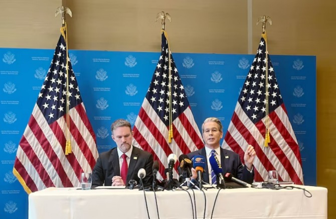 스콧 베센트 미국 재무부 장관과 제이미슨 그리어 미국 무역대표부 대표가 2025년 5월 12일 스위스 제네바에서 열린 중국과의 무역 회담 후 기자회견에 참석하고 있다. 사진=로이터