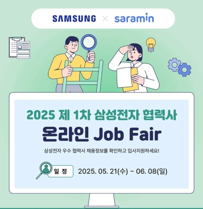 이미지 확대보기종합 커리어 플랫폼 사람인이 삼성전자 협력사 채용을 지원하는 온라인 잡페어를 3년 연속 진행한다. 이번 잡페어는 6월 8일까지 약 3주간 사람인 플랫폼 내 전용 채용관에서 비대면 방식으로 운영되며, 삼성전자 우수 협력사 40여 곳이 참여해 신입 및 경력 인재를 모집한다.