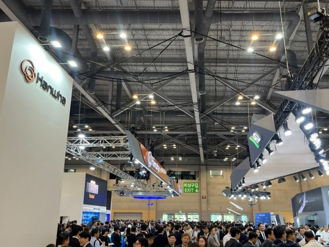 사람들의 시선이 가장 많이 쏠린 곳은 단연 맞은편에 부스를 차린 HD현대중공업과 한화그룹 방산 3사(한화에어로스페이스·한화오션·한화시스템)였다. 두 업체의 전시 제품을 살펴보려는 방문객의 발걸음은 끊이지 않았다.