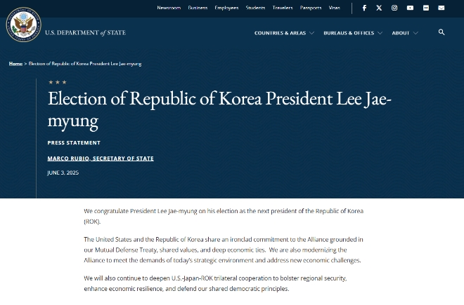 이미지 확대보기마코 루비오 미국 국무부 장관은 이날 발표한 성명에서 “이재명 대통령의 당선을 축하한다”며 “미국과 대한민국은 상호방위조약, 공동의 가치, 깊은 경제 협력에 기반한 철통같은 동맹을 공유하고 있다”고 밝혔다.