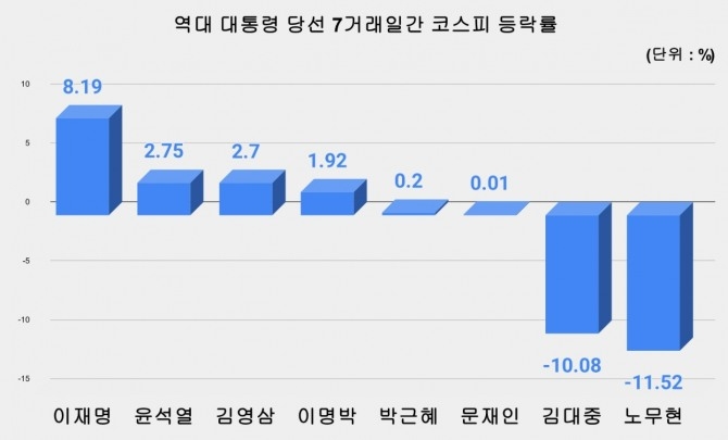 15일 한국거래소에 따르면, 이 대통령이 당선된 지난 2일부터 12일까지 코스피는 총 221.06포인트(8.19%) 상승했다. 이는 문민정부 이후 역대 8차례 대선 직후 7거래일 수익률 중 최고 기록이다.