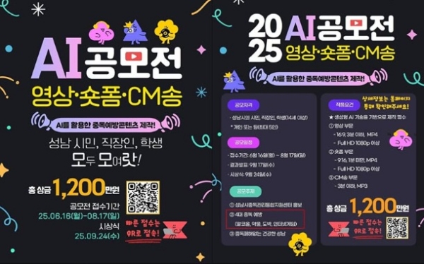 성남시는 최근 14세 이상 시민들을 대상으로 '2025 영상·숏폼·CM송 AI 공모전'을 개최했다. 공모 주제로 성남시중독관리통합지원센터 홍보, 중독 폐해 없는 건강한 성남과 더불어 알코올·약물·도박·인터넷게임을 '4대 중독'으로 묶어 이를 예방하는 내용을 담았다.