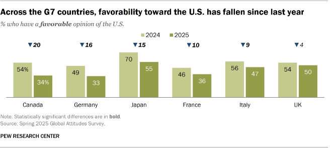 퓨리서치센터는 “미국에 대한 호감도는 지난해보다 대부분의 G7 국가에서 하락했다”면서 “이는 지난 2020년 트럼프 전 대통령의 첫 임기 말 조사 결과와 유사한 수준”이라고 분석했다.
