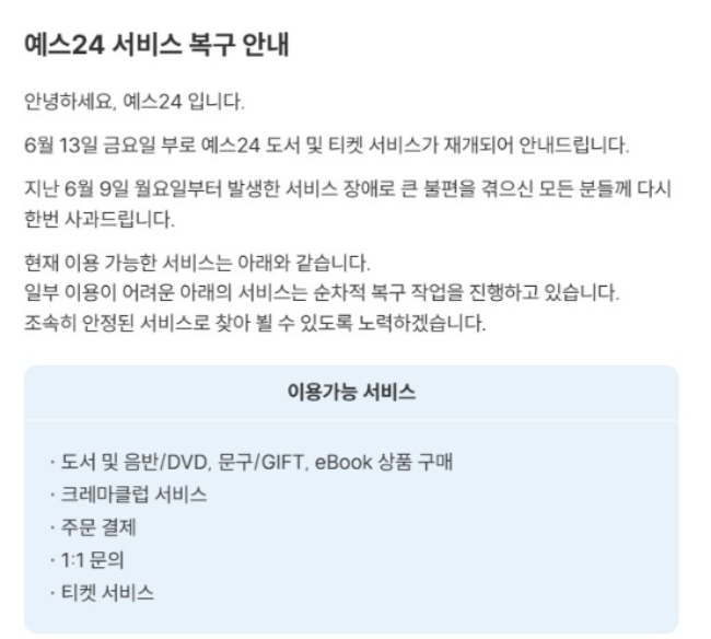 이미지 확대보기예스24는 공지를 통해 도서·음반·DVD·eBook·문구/GIFT 구매, 크레마클럽, 1:1 문의, 티켓 예매, 주문 결제 등은 현재 이용이 가능하다고 밝혔다. 그 외 상품 미리보기 기능과, 리뷰·한줄평, 중고거래, 마이페이지, 통합검색, 출석체크 이벤트 등 부가 서비스는 복구되지 않은 상태다. 지난 11일 2차 입장문을 통해 "공연 현장 입장 처리 시스템을 제외한 서비스는 늦어도 15일까지 정상화될 것"이라 밝힌 바 있지만, 현재까지 실제 복구 시점은 확정되지 않았다.