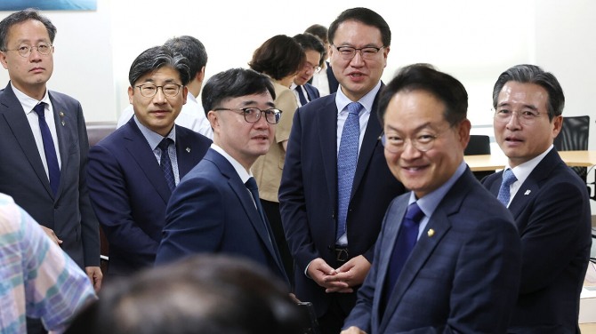 대통령실 김용범 정책실장(오른쪽)과 더불어민주당 허영 원내정책수석부대표(오른쪽 두번째) 등이 18일 서울 여의도 국회 의원회관에서 대통령실과 정부, 여당 등이 함께하는 추경안 관련 비공개 회의에 참석해 대화하고 있다. 사진=연합뉴스이미지 확대보기