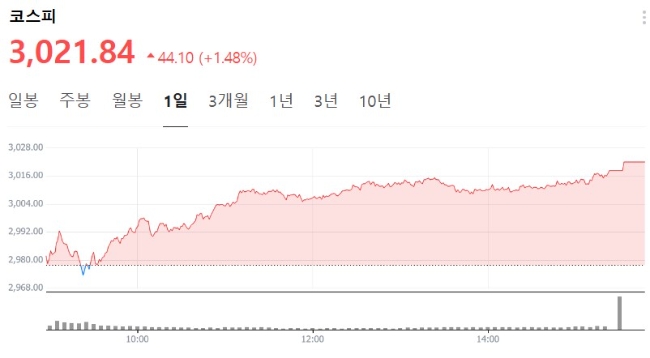 20일 오전 10시 45분 기준, 코스피는 장중 3000.46을 기록하며 2022년 1월 3일 이후 처음으로 3000선을 넘어섰다. 오후 들어 지수는 3,010선까지 오르며 상승폭을 1%대로 확대했다. 외국인과 기관이 순매수세를 이끌었고, 시가총액 상위 10개 종목이 모두 상승했다. 같은 시각 카카오는 7.12% 오른 6만4700원, 네이버는 4.96% 상승한 26만4500원에 거래되며 전일에 이어 이틀 연속 강세를 이어갔다.