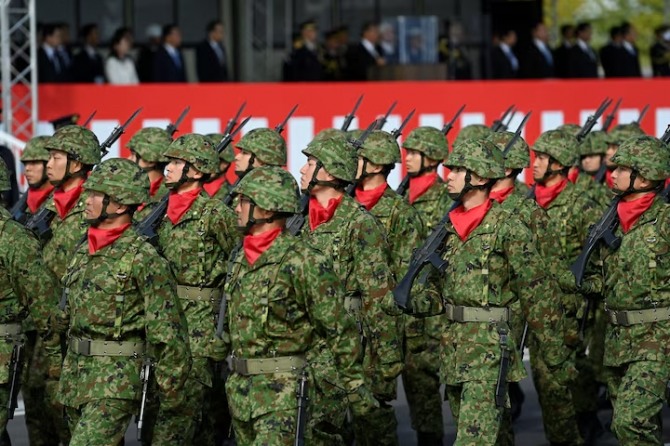2024년 11월 9일 일본 아사카의 지상자위대 캠프 아사카에서 일본 자위대 대원들이 대형을 이루며 행진하고 있다. 사진=로이터