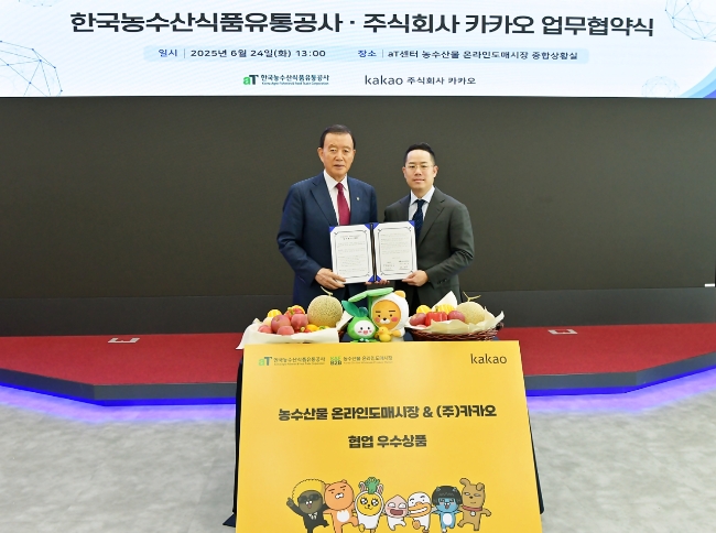 카카오가 한국농수산식품유통공사(aT)와 손잡고 농수산물 온라인도매시장 거래 활성화에 나선다고 24일 밝혔다. 양사는 디지털 전환 가속과 유통 구조 효율화를 통해 우수 농수산물 판로 확대와 농가 소득 증대를 목표로 협력한다.