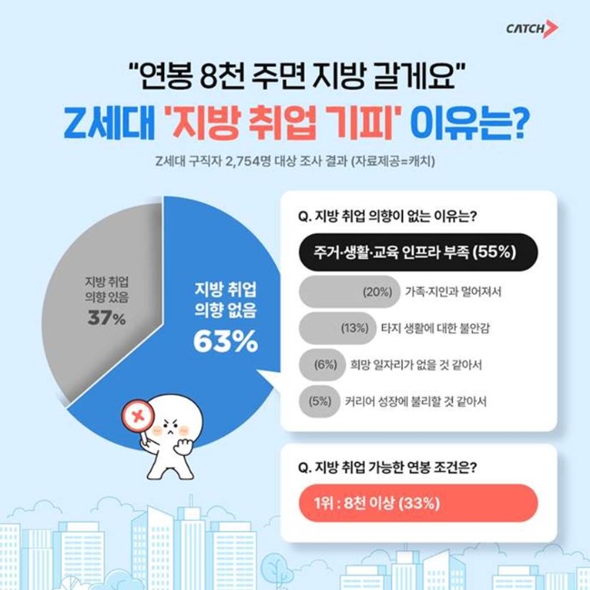 채용 플랫폼 진학사 캐치가 27일 발표한 구직자 2754명을 대상의 설문조사 결과에 따르면, 응답자의 63%는 '지방 취업 의향이 없다'고 답했다. 이 중 20대 응답자만 따지면 89%에 달해, 지방 기피 현상이 Z세대에 집중되어 있음을 보여준다.