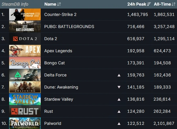 밸브 코퍼레이션의 '카운터 스트라이크 2'와 크래프톤 '펍지: 배틀그라운드' 등 이용자 수 톱5의 순위 변동이 없던 가운데 스타듀 밸리와 팰월드가 새로이 톱10에 진입했다.