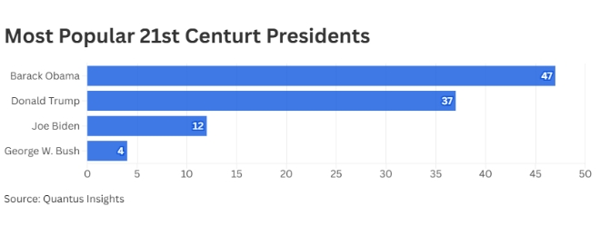 뉴스위크에 따르면 여론조사기관 퀀터스인사이트가 지난달 30일부터 지난 2일까지 미국의 등록 유권자 1000명을 대상으로 실시한 조사에서 오바마는 전체 응답자의 47%로부터 ‘21세기 들어 가장 선호하는 대통령’으로 지목됐다.
