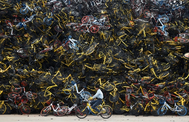지난 2017년 12월 13일(현지시각) 중국 푸젠성 샤먼의 한 공터에 산더미처럼 쌓여 있는 방치된 공유 자전거들 옆을 한 노동자가 공유 자전거를 타고 지나가고 있다. 사진=로이터