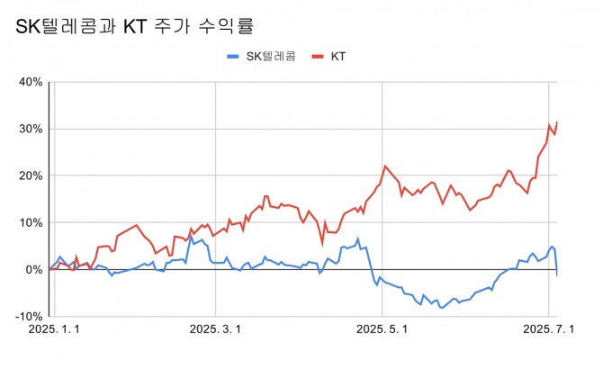 올해 들어 SK텔레콤 주가는 부진한 흐름을 이어가고 있다. 7일 종가는 5만3900원으로 지난해 말 대비 2.36% 하락했다. 같은 기간 KT는 5만7100원으로 30.22% 상승해 대조적이다.