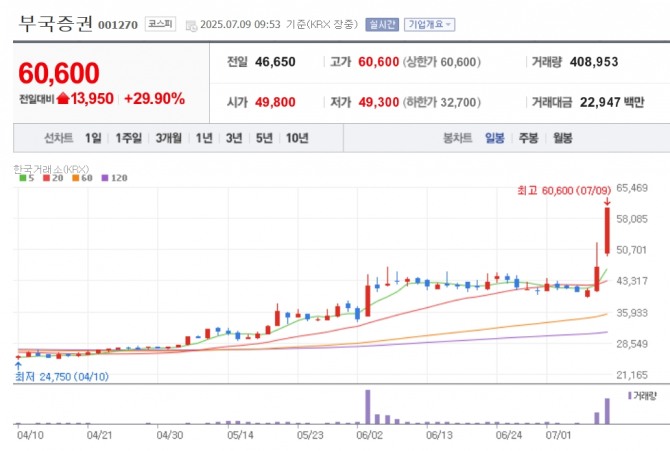 이미지 확대보기9일 한국거래소에 따르면 오전 9시 53분 기준 부국증권은 전 거래일 대비 29.90% 오른 6만 600원으로 신고가를 경신하고 있다. 신영증권은 18.17% 오른 16만 7800원에 거래되고 있다. 장중 16만 8900원으로 신고가를 찍었다.