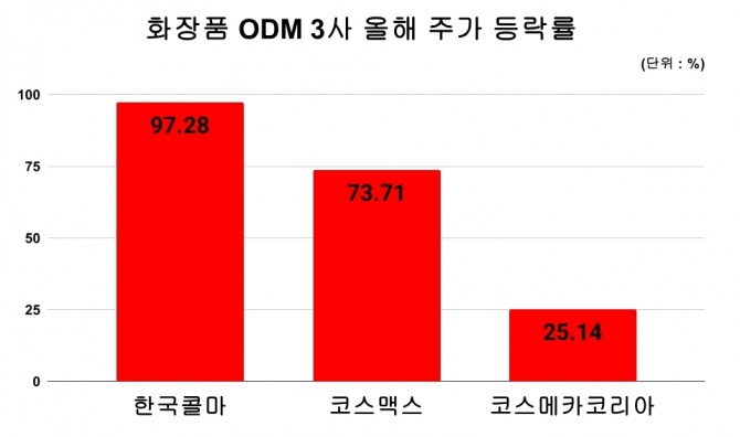 실제 주요 ODM 3사의 올해 들어 주가 상승률은 두드러진다. 한국콜마는 지난 15일 종가 기준 연초 대비 97.28% 급등했고, 코스맥스는 73.71%, 코스메카코리아는 25.14% 상승했다.