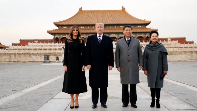 지난 2017년 11월 8일(현지시각) 중국 베이징 자금성에서 멜라니아 트럼프(왼쪽부터), 도널드 트럼프 미국 대통령, 시진핑 중국 국가주석, 펑리위안 여사가 함께 포즈를 취하고 있다. 사진=로이터