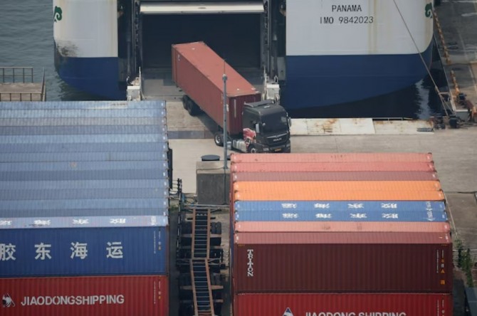 미국의 '상호 관세' 발효(8월 1일) 시한이 다가오면서 수출 전선에 긴장감이 높아지고 있다. 사진은 지난 8일 대한민국 수출입 관문인 평택항에서 트럭이 컨테이너를 내리는 모습. 사진=로이터