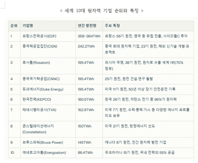 이어 미국의 '테네시밸리공사(Tennessee Valley Authority)'가 152.9TWh, '콘스텔레이션에너지(Constellation Energy)'가 150TWh로 7·8위다. 캐나다의 '브루스파워(Bruce Power)'와 우크라이나의 '에네르고아톰(Energoatom)'도 10위 안에 들어갔다.