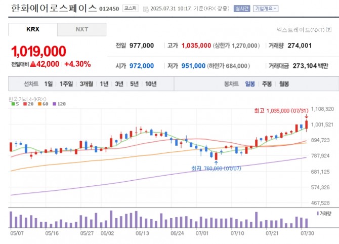 이미지 확대보기31일 한국거래소에 따르면 오전 10시 17분 한화에어로스페이스는 코스피시장에서 전일보다 4.30% 오른 101만9000원에 거래되고 있다. 이날 장 초반 95만1000원까지 밀렸다가 실적 발표와 함께 반등, 장중 사상 최고가인 103만5000원을 찍었다.