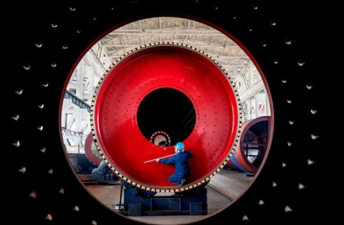 한 직원이 중국 장쑤성 난퉁의 한 공장에서 새로 제조된 볼 밀 기계를 측정하고 있다. 사진=로이터