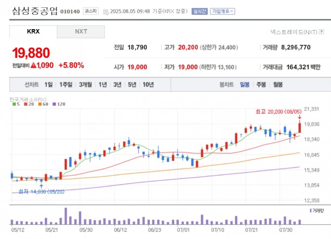 5일 한국거래소에 따르면 이날 오전 9시48분 현재 삼성중공업은 전거래일 대비 5.80% 오른 1만9880원에 거래 중이다. 장중 전장보다 7.5% 상승한 2만 200원까지 오르면서 52주 신고가도 다시 썼다.