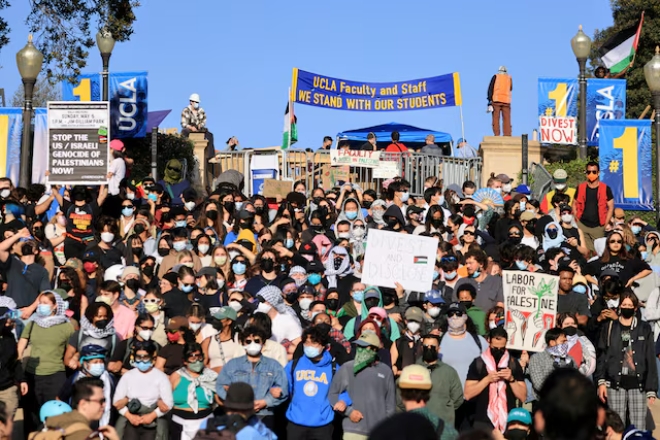 지난해 5월 1일(현지시각) 미국 캘리포니아대학교 로스앤젤레스캠퍼스(UCLA)에서 친팔레스타인 집회가 열리고 있다. 사진=로이터