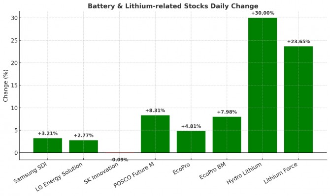 시장 전문가들은 "리튬 가격 반등이 2차전지 밸류체인 전반의 투자심리를 개선했다"며 "단기적으로 소재주 중심의 강세 흐름이 이어질 가능성이 높다"고 진단했다.