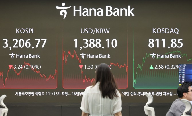 이미지 확대보기11일 오후 서울 중구 하나은행 딜링룸에서 딜러들이 업무를 보고 있다. 코스피가 전 거래일보다 3.24포인트(0.10%) 내린 3206.77에 마감했다. 코스닥 지수는 전 거래일보다 2.58포인트(0.32%) 상승한 811.85, 원·달러 환율은 전 거래일 주간거래 종가보다 1.6원 내린 1388.0원에 마감했다. 사진=뉴시스