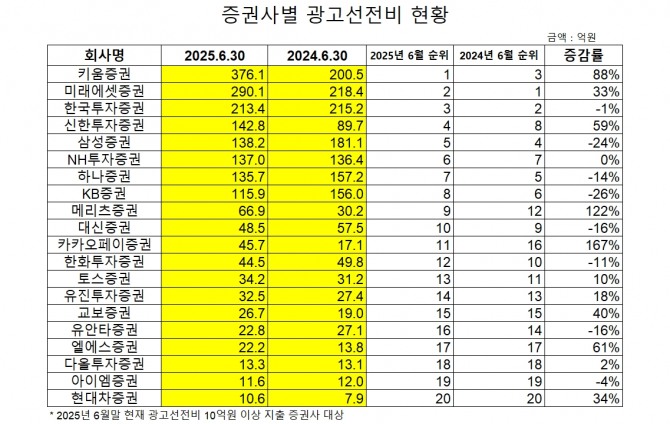 이미지 확대보기19일 글로벌이코노믹이 2025년 상반기 기준 10억원 이상의 광고선전비를 집행한 증권사를 대상으로 비교 분석한 결과 키움증권이 미래에셋증권을 제치고 광고선전비 집행 1위를 기록한 것으로 나타났다.
